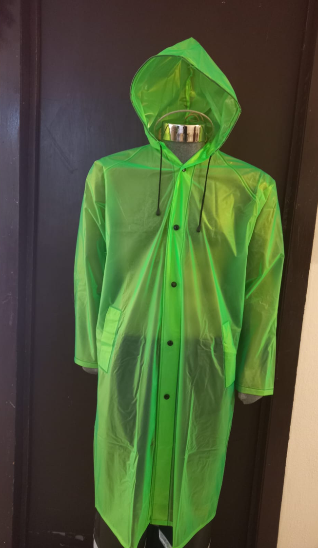 IMPERMEABLE TIPO GABARDINA LARGA CON CAPUCHA INTREGRADA, CINCO BROCHES DE PLASTICO AL FRENTE. ABERTURA LATERAL PARA ENTRADA DE BOLSA AL PANTALÓN, CONFECCIONADA EN PVC (CLORURO DE POLIVINILO). CALIBRE 8. FABRICADA EN VARIOS COLORES.